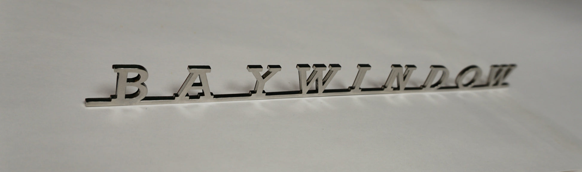 BAYWINDOW Script badge , lazer cut from stainless steel and then fully polished to a deep chrome finish. All badges have 3M outdoor tape on the back for quick and easy attachment