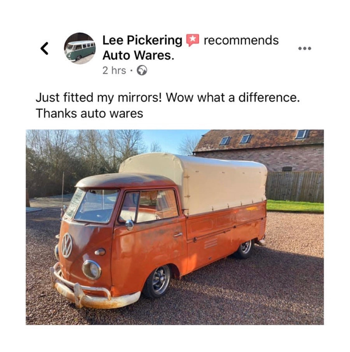 The Auto Wares Splitscreen convex mirror is Identical in size and profile to the original factory items your bus left with the factory with, however, they have the benefit of convex glass to provide you with a greater field of view enabling you to see much more of the road beside you.