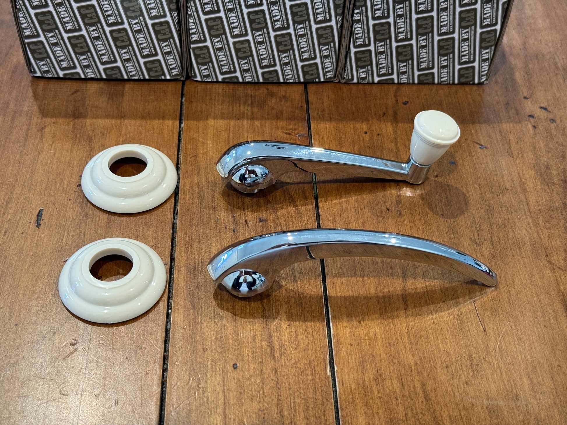 This door winder & release sets are made with the correct matching color knobs & rings and finished in a show quality chrome.